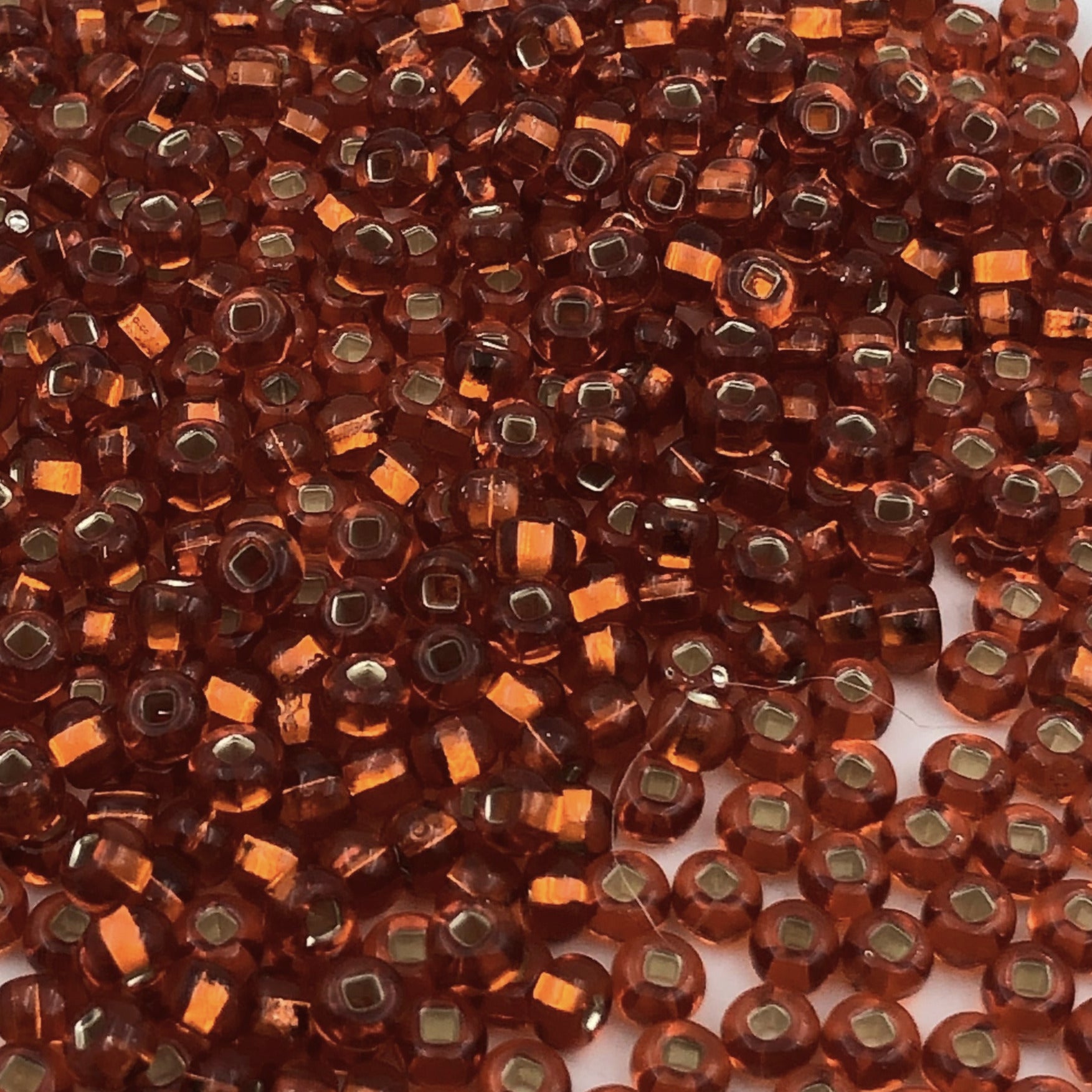 6/0 seed beads.  Made in the Czech Republic.  Czech seed beads are good quality, although not as uniform as Japanese seed beads.