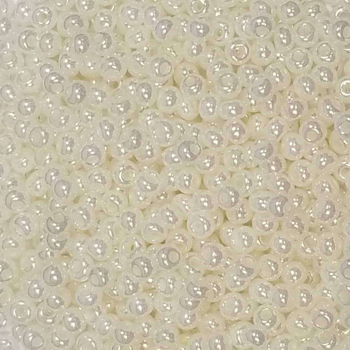 6/0 seed beads. Made in the Czech Republic. Czech seed beads are good quality, although not as uniform as Japanese seed beads.